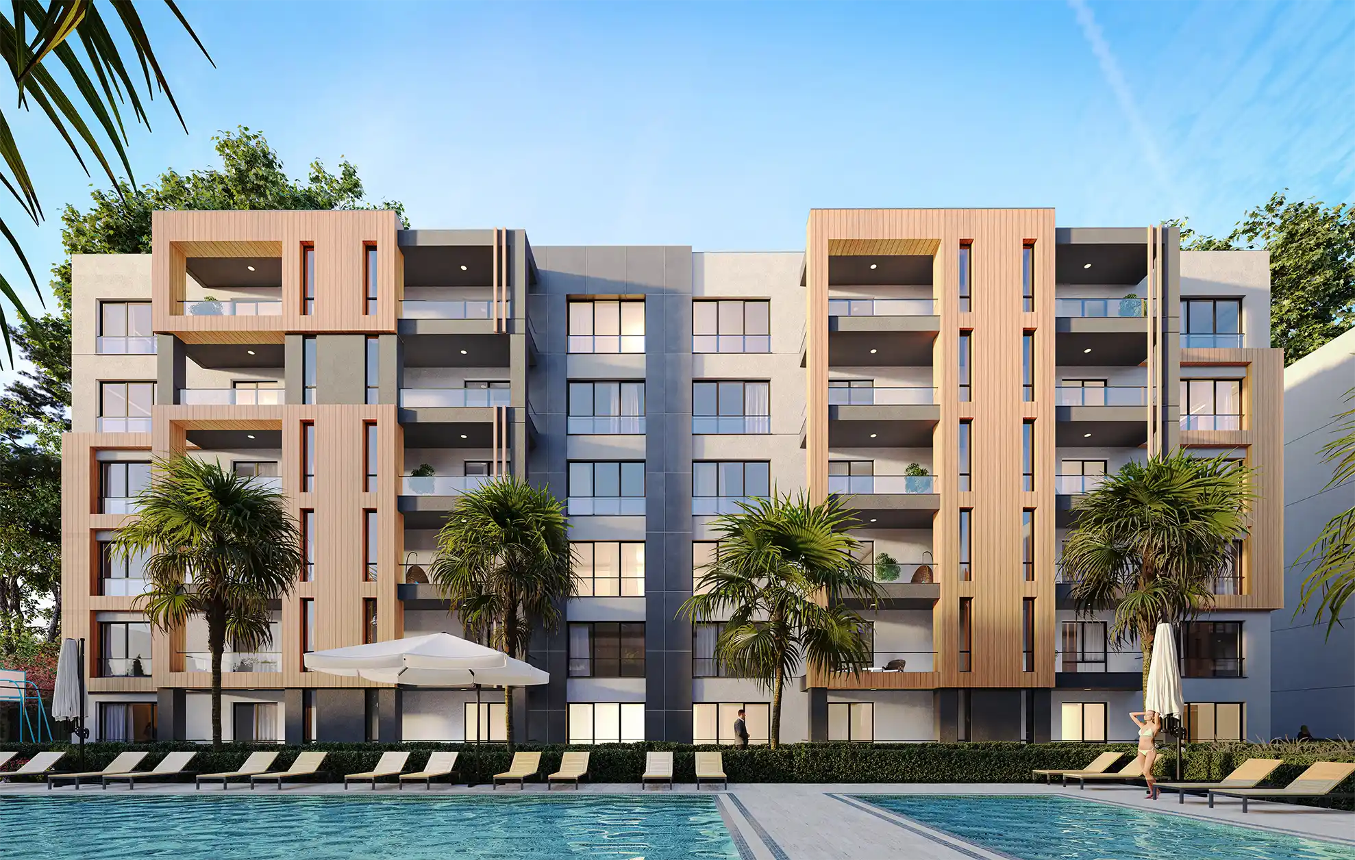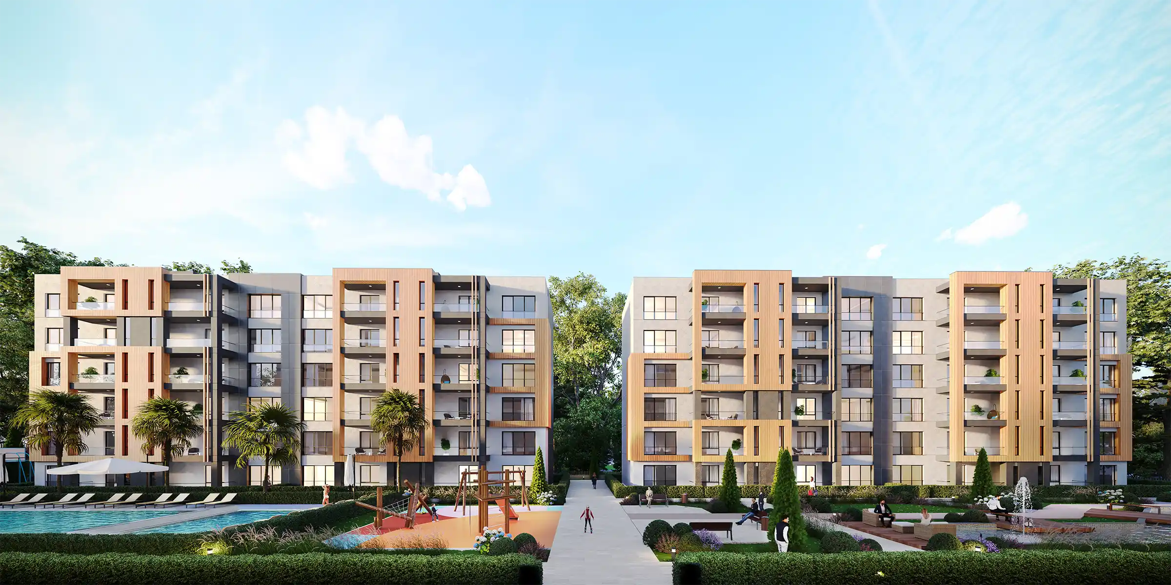 Lüks Havuz Konsepti: Site merkezinde yer alan, şezlong alanlarıyla çevrili geniş yüzme havuzu.